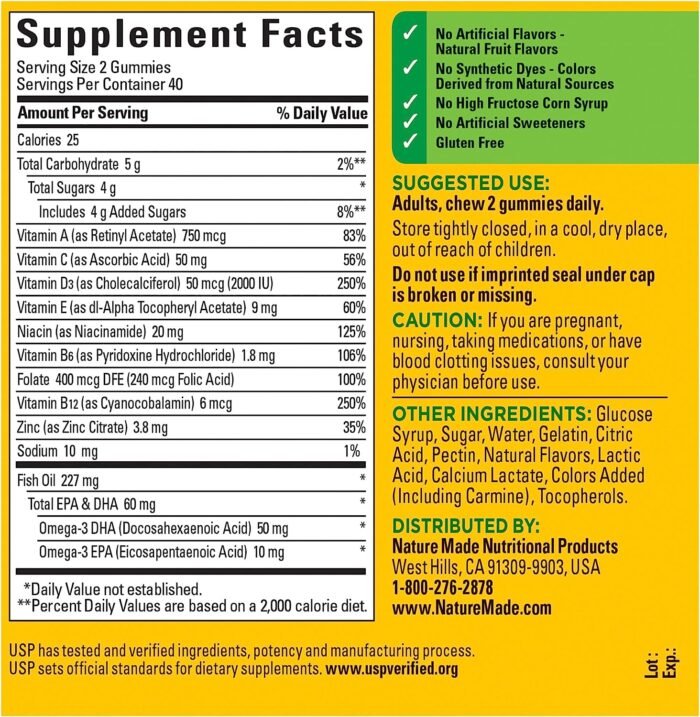 - Nutritional support supplement: contains one 80 count bottle of Nature Made Multivitamin + Omega-3 Gummies for a 40 day supply
